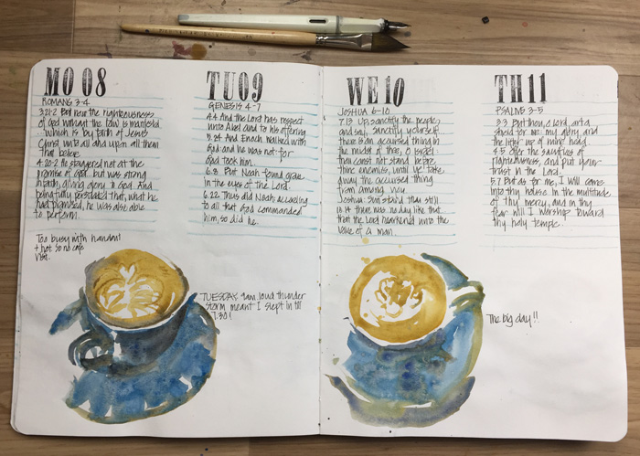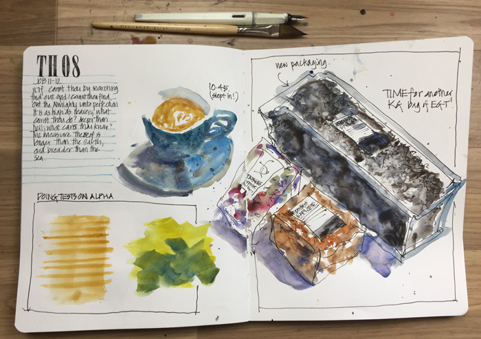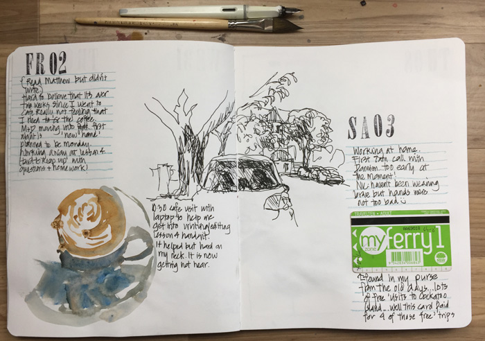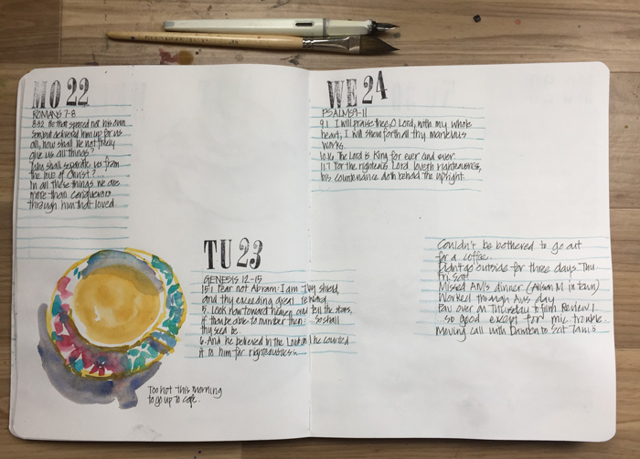 So it is not surprising that I haven’t been sketching and I haven’t even been getting out to my local cafe for my morning latte! The result was that there were a few spreads with one or two sketches and then just text from my morning readings.