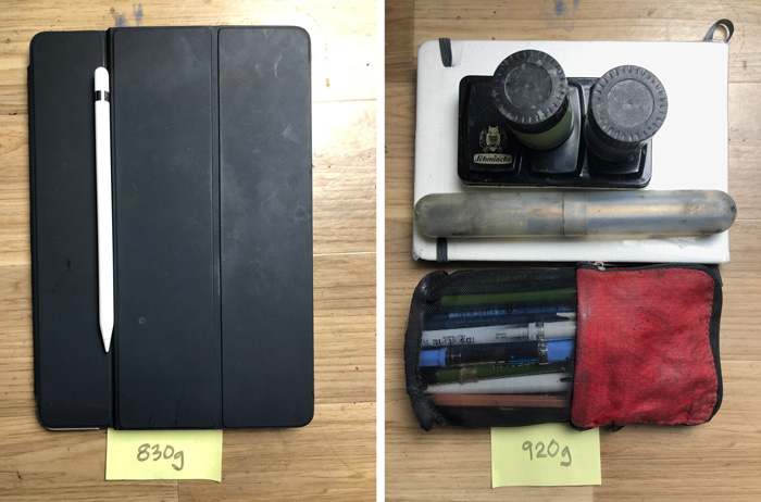 Rob gave an impressive talk at Sketchfest and among his arguments for why iPad sketching is so good, he mentioned weight. Really? I was a bit skeptical so I decided to weigh my kit. I’m using a small A5 sketchbook at the moment, and with all my pens and watercolour it was actually a little heavier than the iPad and pencil. However a battery pack would add more weight to the digital kit!