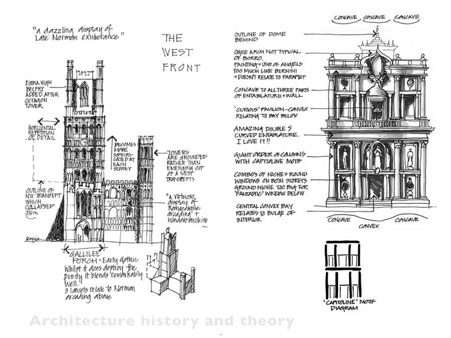 - seeing the underlying volumes and sketching these first in order to establish the building as a whole before adding the details