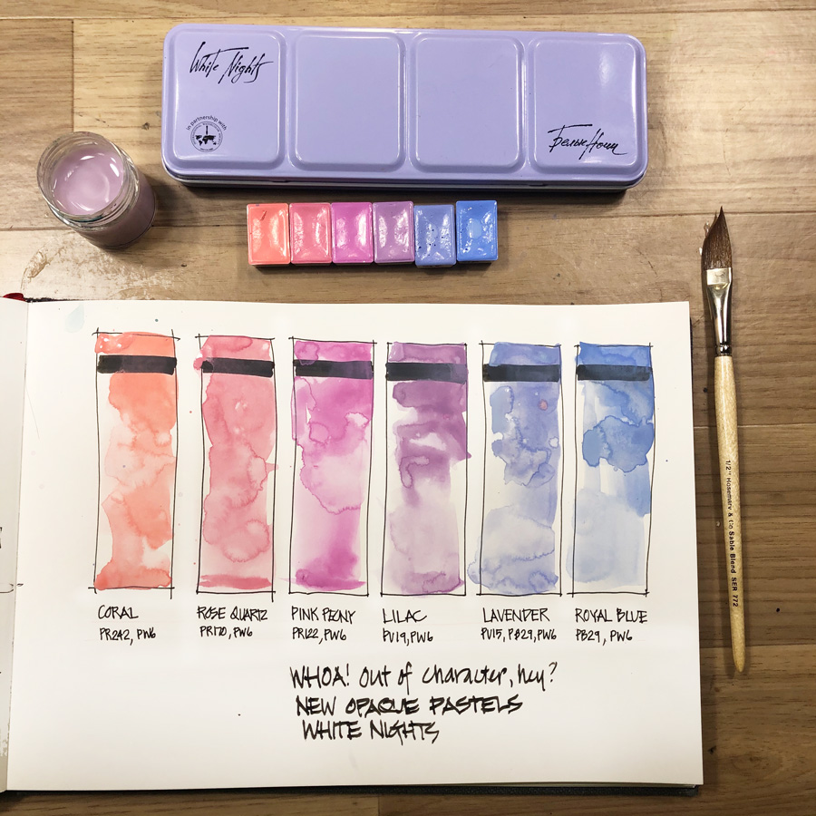 It could be interesting to do a series of technical studies comparing these opaque watercolors with white gouache into which you’ve mixed the same pigments. The main factor I’d be comparing is the lift ability of the gouache compared with the PW6 pigment in watercolor paints. I like to use PW6 in watercolor sometimes as a glaze to knock-back certain areas, and have begun playing with gouache (plain white and colored) for that purpose. But in my experience gouache in a sketchbook is more risky than watercolor because of the re-soluability of the gouache.