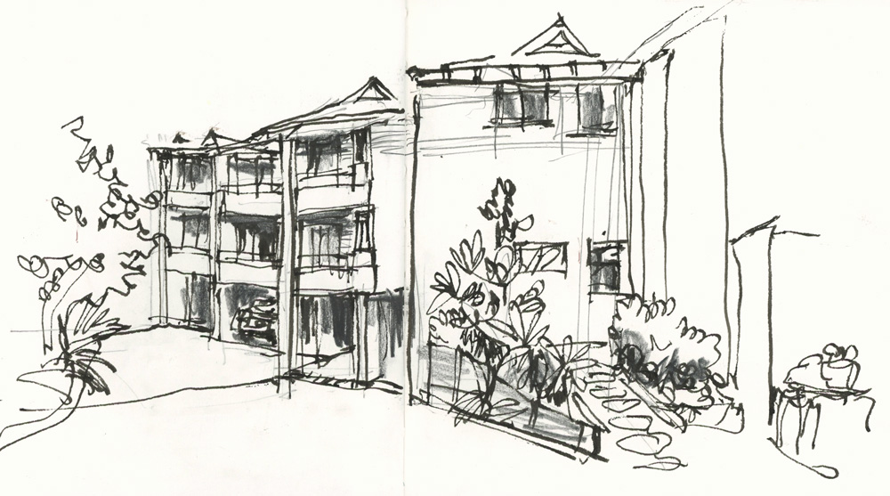 Thanks Jamie. These sketches are not in my new ‘hood but a building/complex that has been part of my life since I was a child. It’s due to be demolished soon so these are quick sketches (either standing or on a stool) of views that mean something to me.