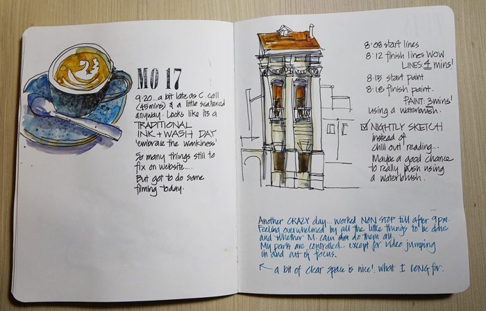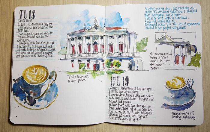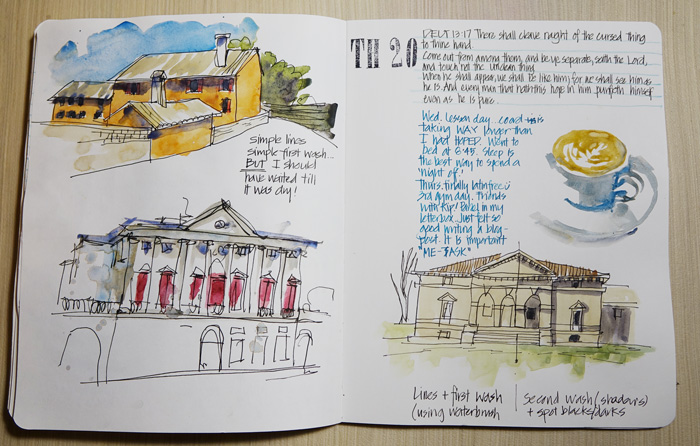 Anyway, here are a few pages from this week – including my notes about all the website dramas and work I had to do each day. This is not my typical way of working as I am thinking through the Palladian Odyssey programme and also some common struggles of beginners when it comes to travel watercolour sketching. The purpose of these sketches is to explore ideas… and I enjoyed doing them a lot!