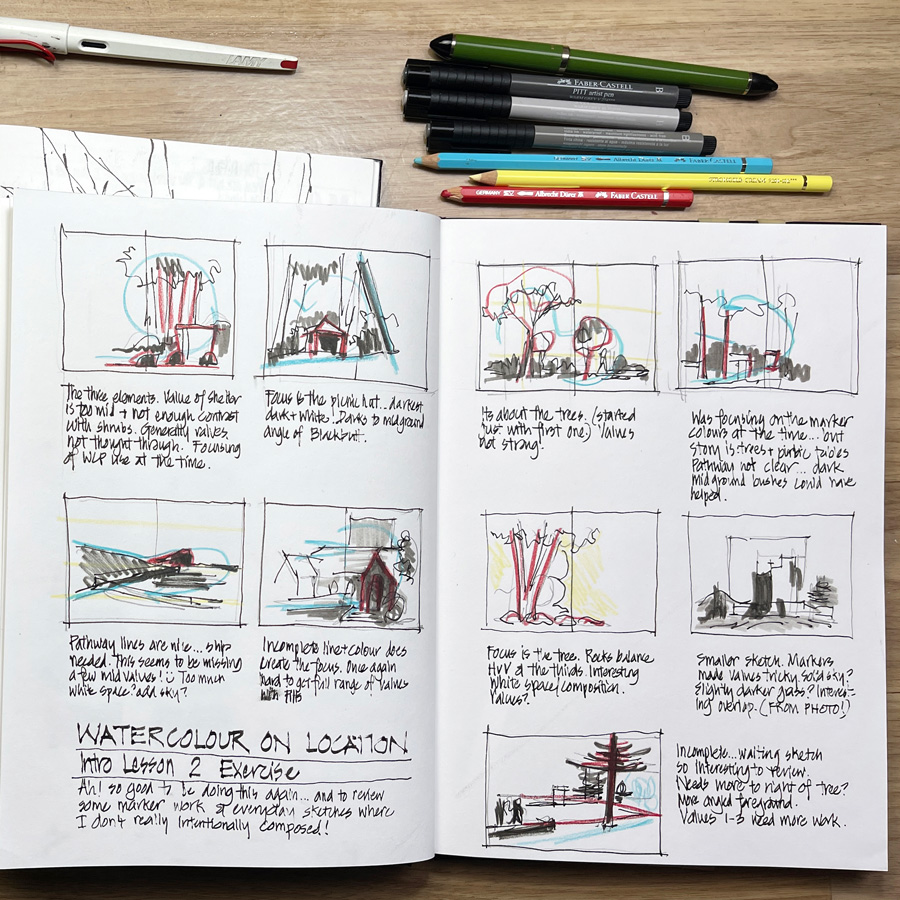 I had a number of goals with my sketching today: do the drawing exercise as part of the Watercolour On Location Intro Lesson 4 think more about the concepts I discovered while doing the Intro Lesson 2 exercise (see here for more about that ) As a part of the general prep for the Live...