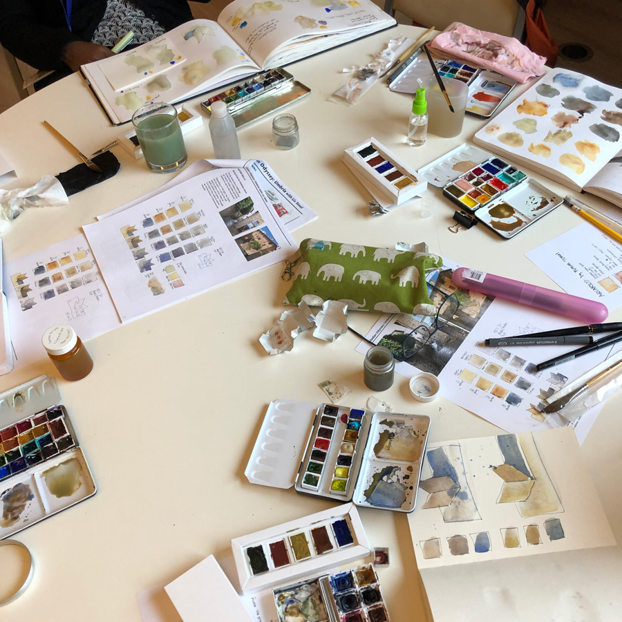 Welcome lunch – warmup drawing and then a fun session mixing watercolour.