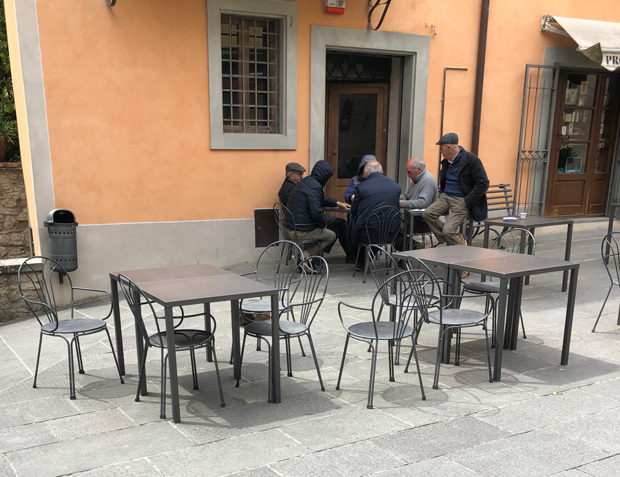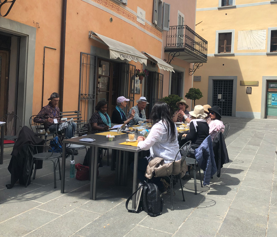 A special thankyou to Andy from England but now lives in Montone (left) who helped with lunch both weeks (Mike was out of town on the Montone days with the Plus Ones). He who made the best salads! The cafe only serves pizzas and sandwiches, so it was a big deal to offer salads to us. I love this photo as it records what was happening as soon as our lunch was over – ‘Super Andy’ and the cafe owners sat down to eat salad.