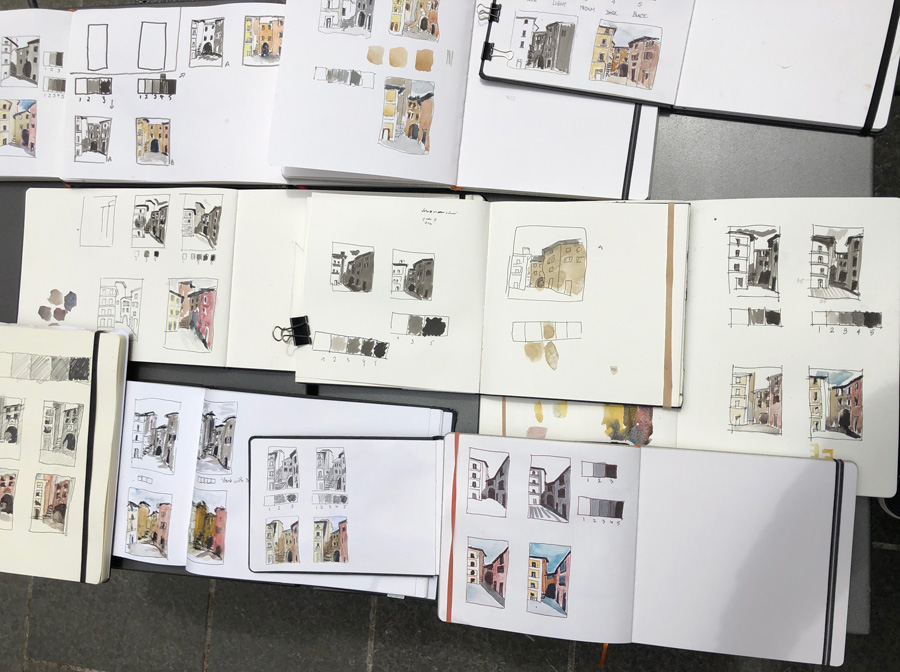After a warm coffee or hot chocolate in Aries Cafe, we sat in the piazza (my outdoor classroom) to do some value studies.