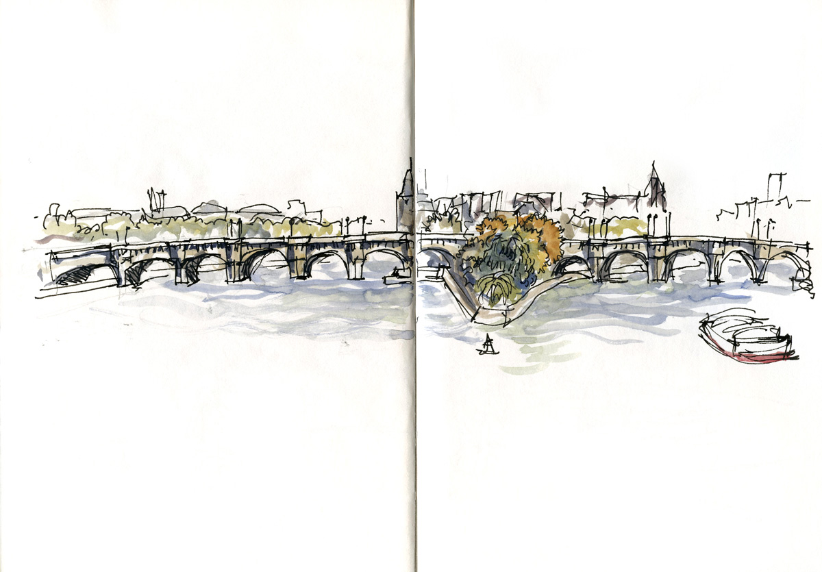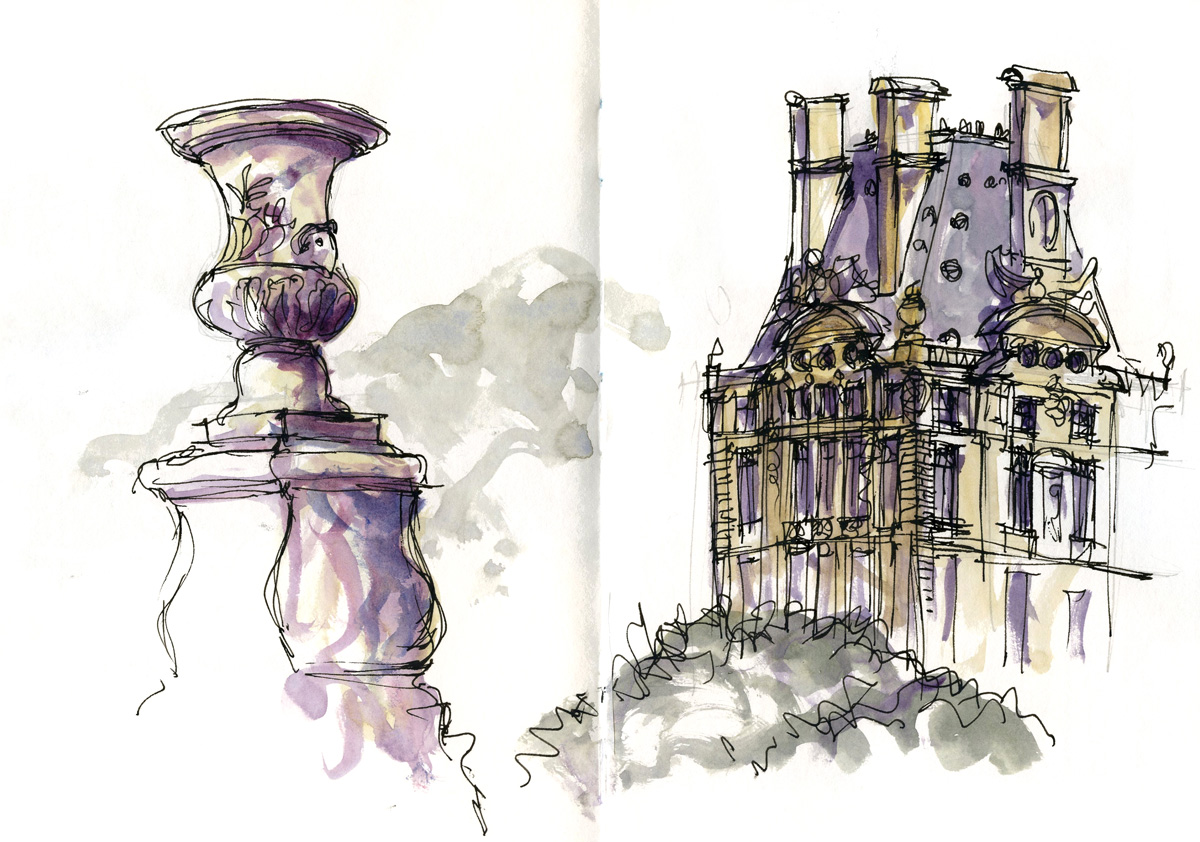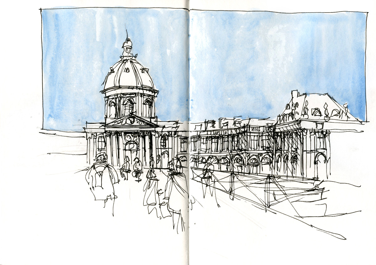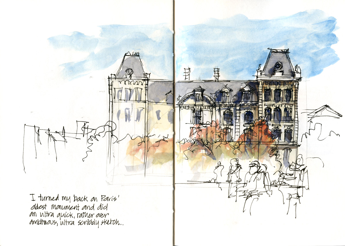 During my week in Paris, I tried to sneak in a second sketch from each location because although I was slowing down, I was still generally faster than Eza. On this occasion with Jan and Eza and doing so much talking I didn’t have that much extra time so only got a small part started (on the right)