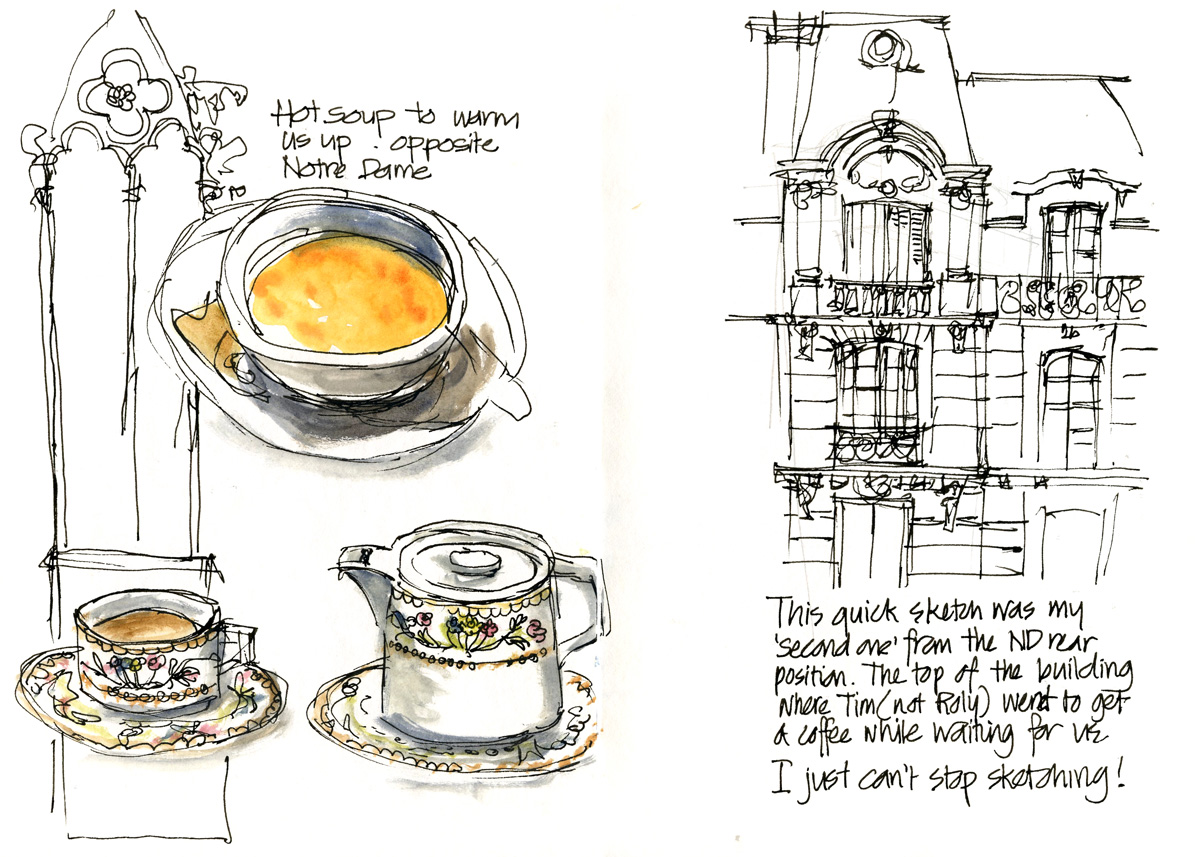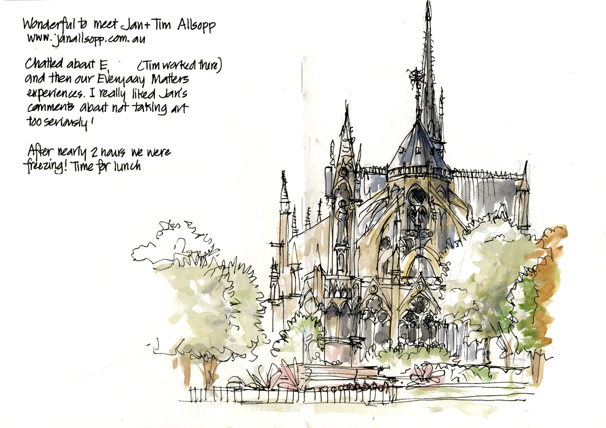 About the sketch, we sat on a bench and sketched the rear of Notre Dame – chatting all the time – I think I did my fair share of the talking and once again am surprised how well the sketch came out considering how I wasn’t concentrating too hard (I think that I was only about to do this as I had been sketching non stop for the last 4 weeks)