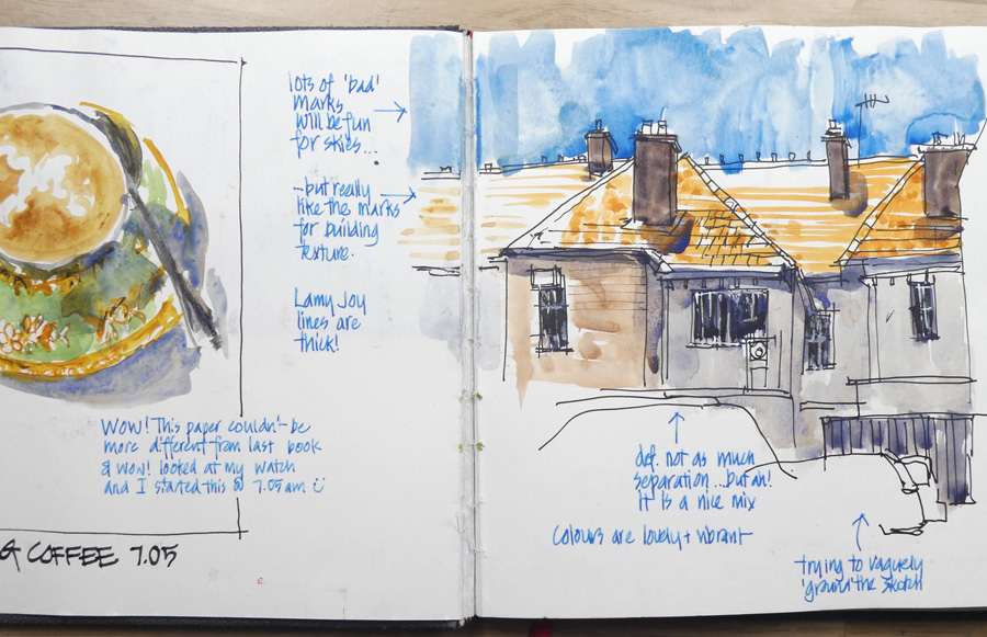 The one thing that was difficult for me was the size of the book. I would not normally choose to use an A4 landscape book as a everyday sketchbook. But Hahnemuehle sketchbooks are SO incredibly difficult to find in Australia that when I found this book (old stock) I bought it immediately. I’m used to using 150gsm paper for my everyday sketchbooks so the heavier weight felt a little more precious and this prevented me on some occasions from attempting a super quick rough sketch.