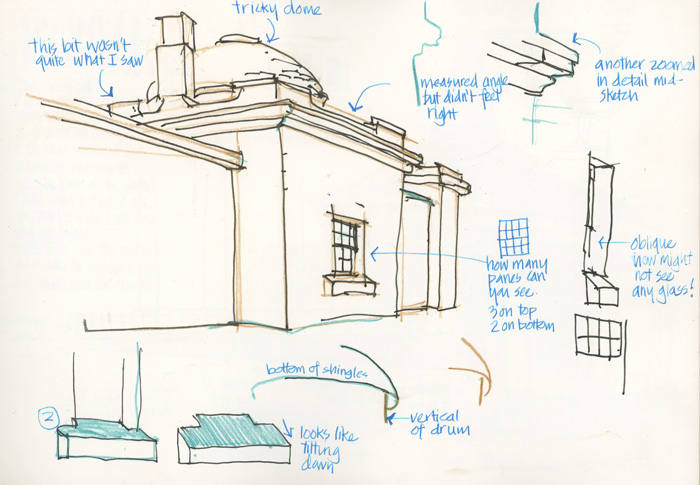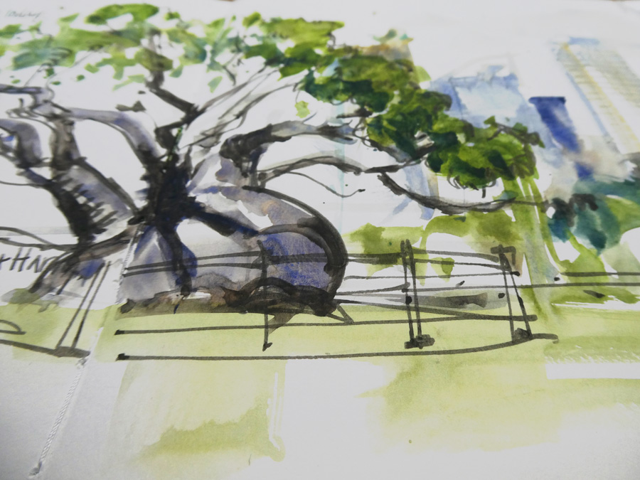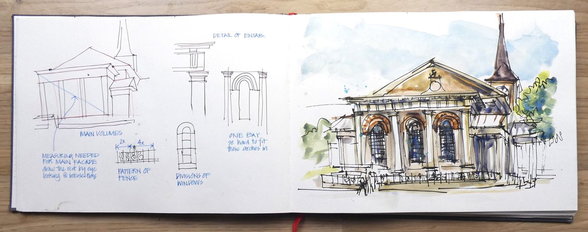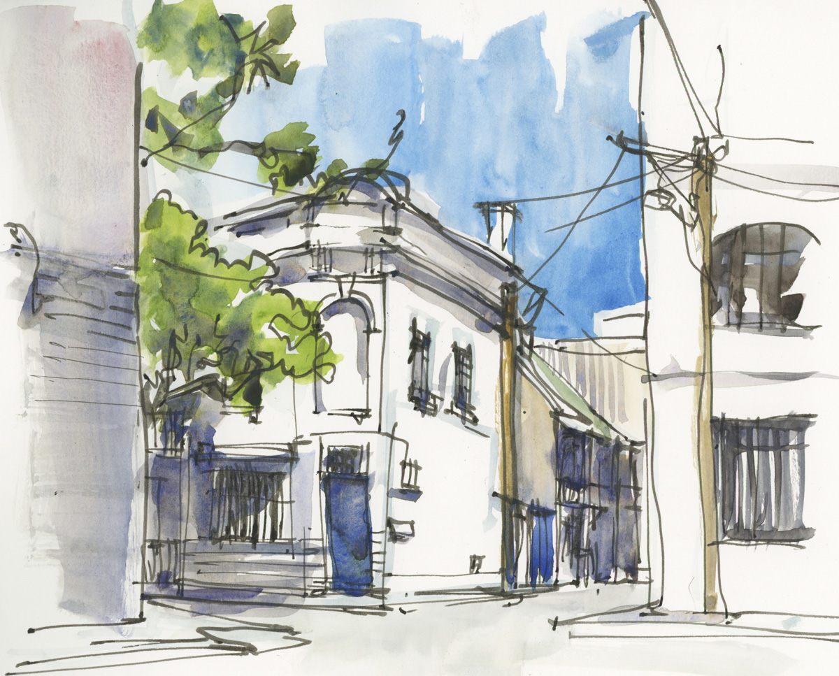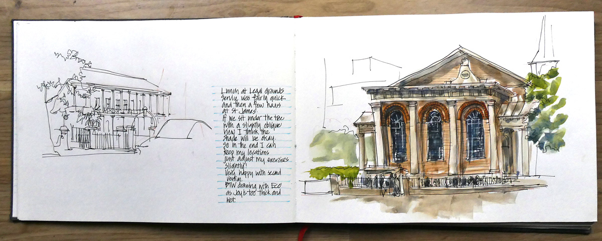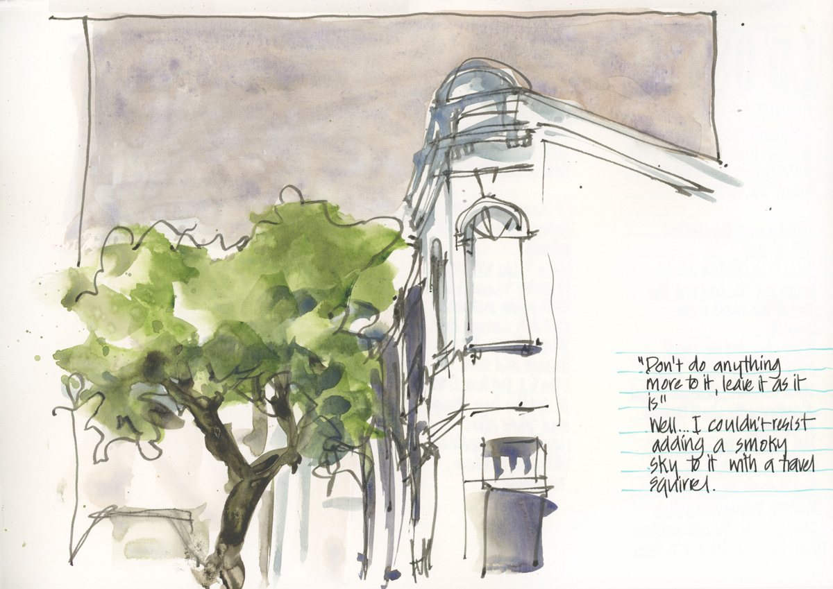 The Nostalgie is my go-to book, the one I have in my bag and by the bed. One thing that is a bit hard for me is the high cost of watercolor books. I can’t afford to just screw around in them. So the Nostalgie is a nice midway book — in the states it typically runs about $4 less per book for Nostalgie versus the Watercolour… Nostalgie isn’t “meant” for watercolor — it is a sketchbook — but the paper takes a watercolor wash pretty well (I clip, and up to two washes as long as I don’t fuss, as you say) and at the A5 landscape size (my fooling around size) I find it comfortable to do business sketches and watercolors and not think about it — I always have one with me. I love the paper for ink… it has enough tooth (not a fan of hot pressed) yet takes the pen so well!