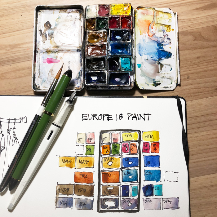 - I did need replacements for my two reds – DS Quin Rose and DS Transparent Pyrrol Orange. I have never had to replace them before, but in hindsight I should have added a spare for both especially as I had plenty of red roofs to sketch over the 11 weeks. I was able to ask local sketcher Chantal Vincent (thanks!) to make up a half pan of each colour and bring them to Porto which was great.
