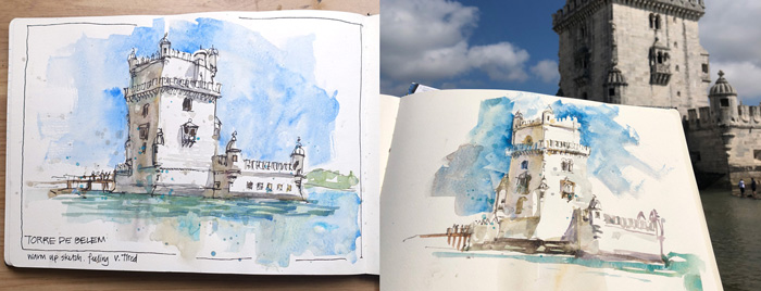 Even though I was very much in the groove – a result of sketching non-stop the whole trip – I found it interesting that I was still trying to do everything (the kitchen sink approach) with my first sketch of a scene. My aim with my sketching is to say more with less – to do minimal lines and washes and to achieve a realistic abstraction (is that the right term?) But at present I still need to do the ‘normal’ sketch first before I get in the right way of thinking how to abstract and simplify. I think was most apparent in the sketches I did at St Andrews and at Belem.