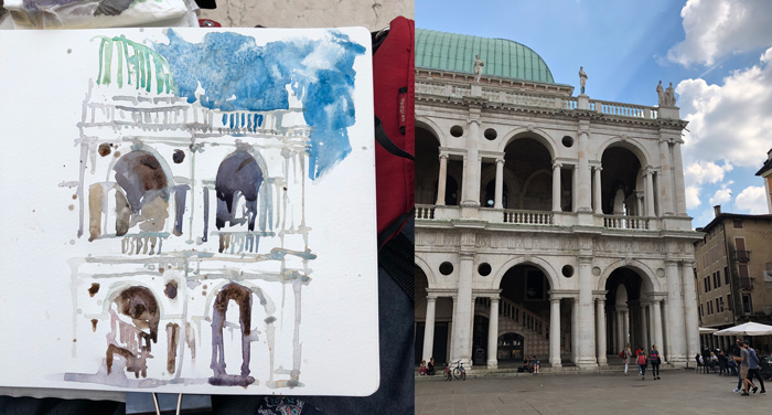But as soon as I arrived in Vicenza, it all came back. One of the most significant sketches I’ve done for a long time is this one above of Palladio’s Basicilia in Vicenza. It was my first sketch as soon as I arrived (before a good nights sleep) and it worked! Normally my first sketch is a bit disappointing, but I was so happy with this one. It was a sign that “Liz” was back.