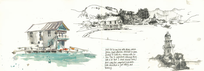 Rather than a single big painting to describe this harbour, I did three smaller sketches, each using a different technique.
