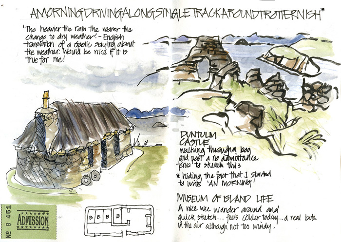 I’m really enjoying the Sketchbook Revival event as it’s making me think about what is special about creating art inside a sketchbook. There are many reasons… but an important one for me is the compositional fun that comes from designing a sketchbook page/double page spread. It’s not just the individual sketch, it’s the collection of a number of images, text, headings, maps, collage etc. For me this takes the pressure off creating a masterpiece with every sketch because I can nearly always create a pleasing composition on the page by adding these additional elements.