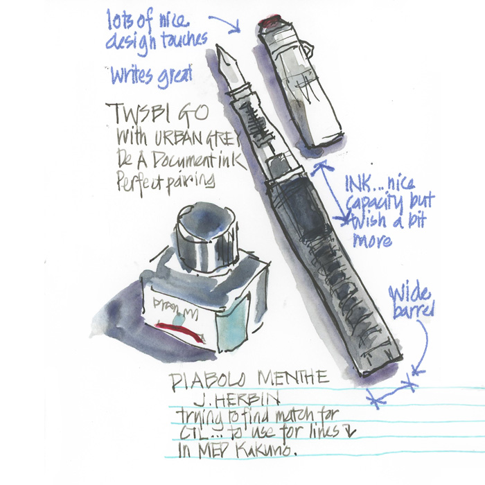 I got a new Twsbi Go pen in grey from Larry Post and filled it up with the new Urban Grey in De Atramentis Document ink. A perfect pairing! I like the pen even though the barrel is thick and the spring loaded pump (fun feature) is so huge (it has a good ink capacity but I can’t help thinking it could be bigger). Lots of lovely little details too.