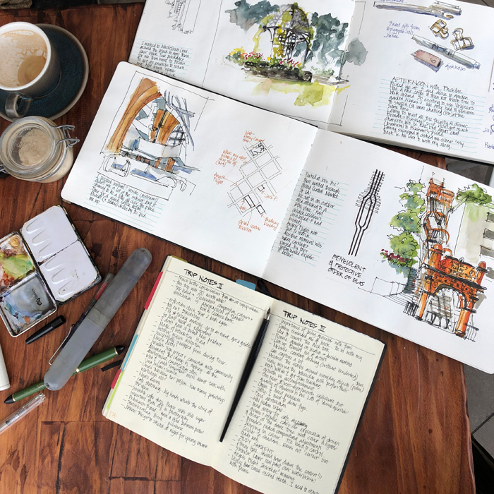 Lots to love here! First, the variety is wonderful. In some video of Brenda Swenson, I believe she referred to this type of page as a sketch collage. Brilliant idea….combining many things! Second, I like the sharing of 3 thoughts so simply listed out with numbers! And third, I am very interested in that journal with Trip notes I and II. What do you include there?