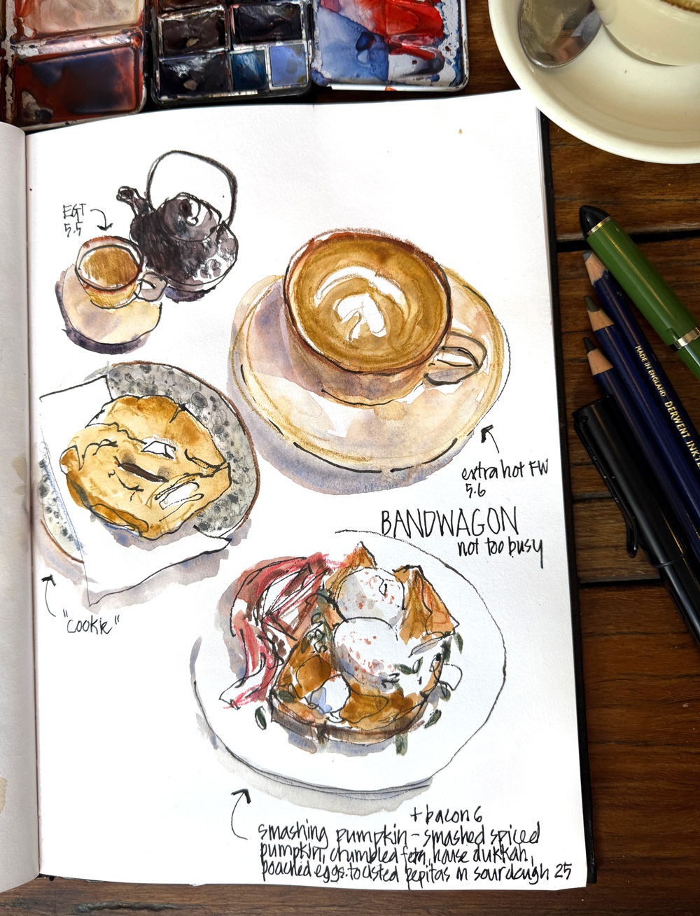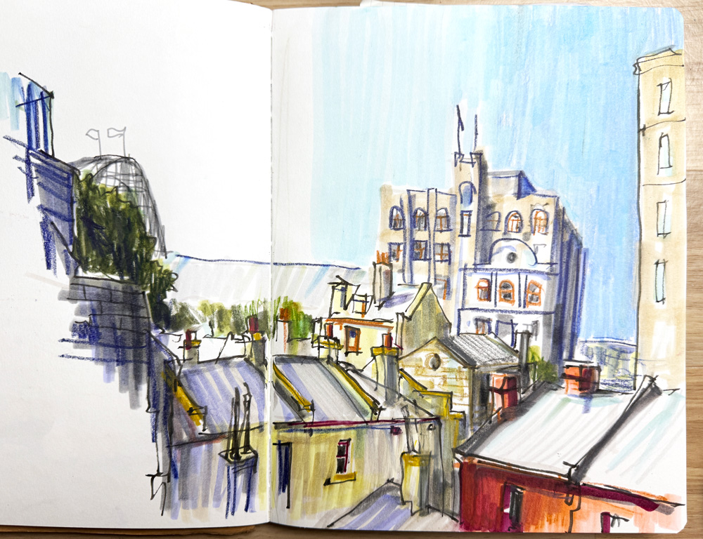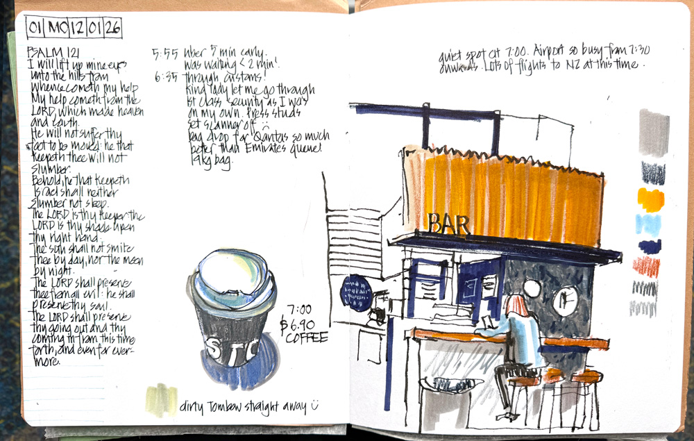 Aside: I used to do watercolour sketches on the plane but it’s a hassle with water containers etc so in recent years I’ve decided to stick to dry (or quick drying) media.