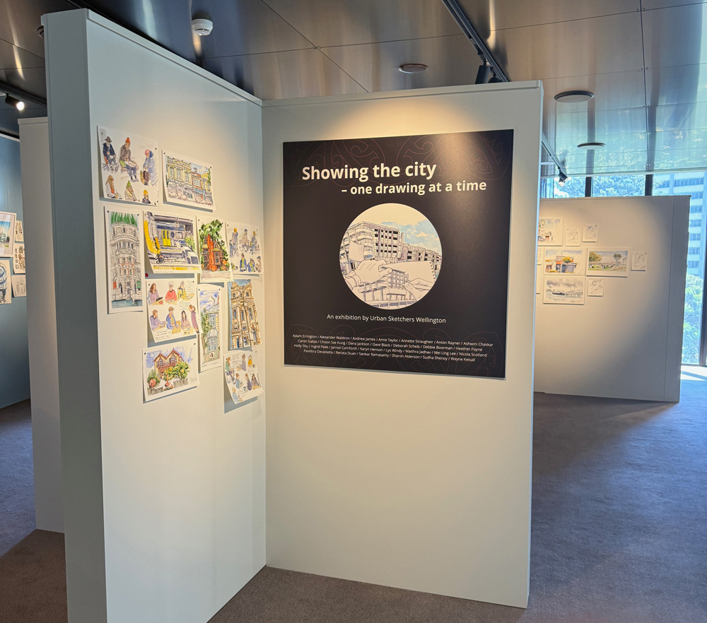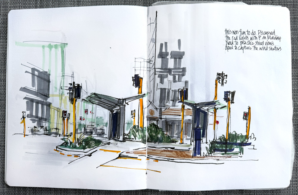 Thursday: Sketching the wind/rain shelters of Wellington from the comfort of a cafe.
