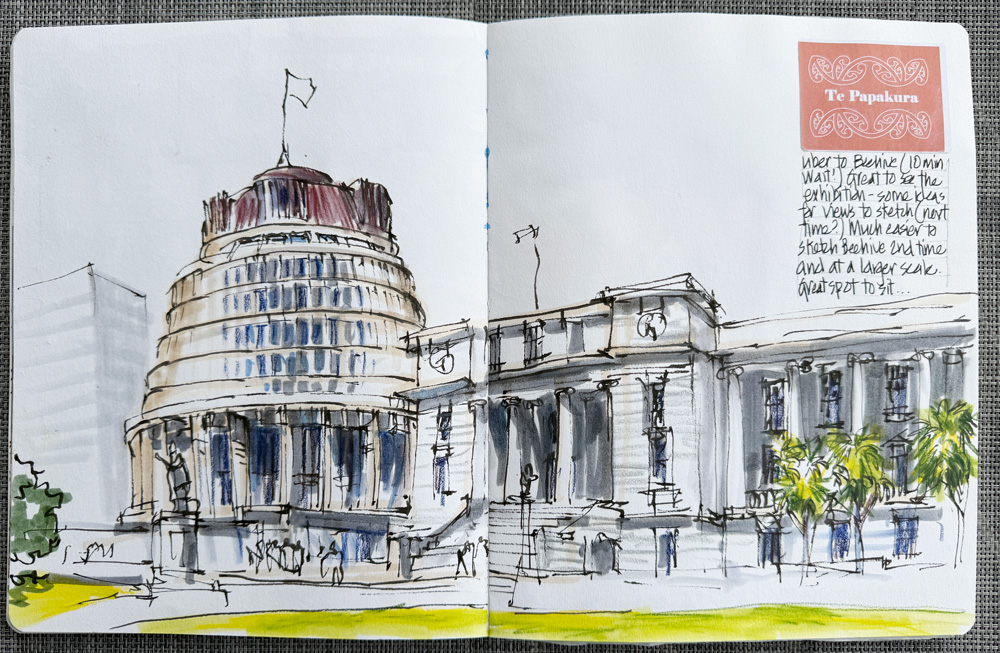 Walking back into the downtown via a cemetery. The Beehive building (parliament offices) is not my favourite type of building to sketch.