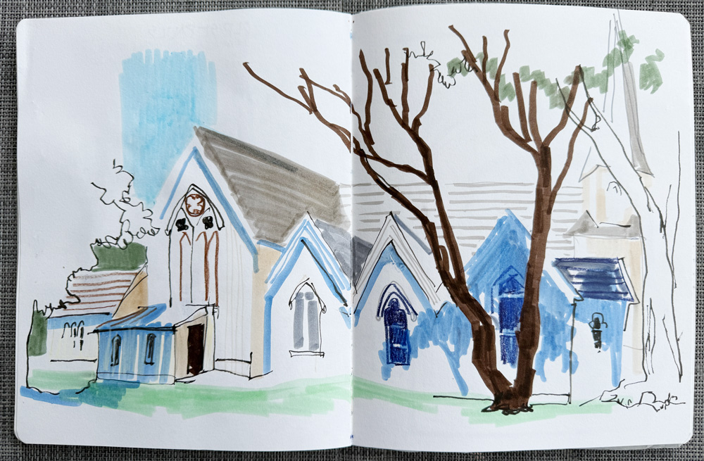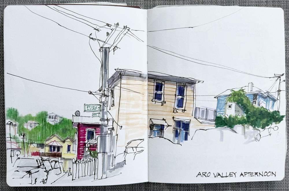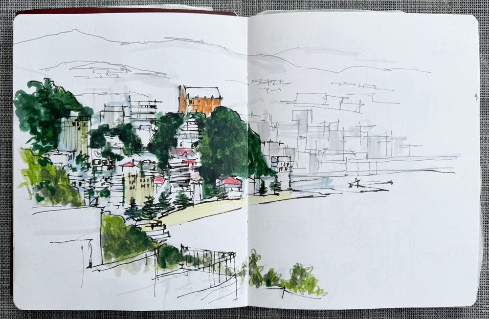 Peter found a great street view to sketch and I sat next to him but did a wider view – trying to capture the hills and houses.