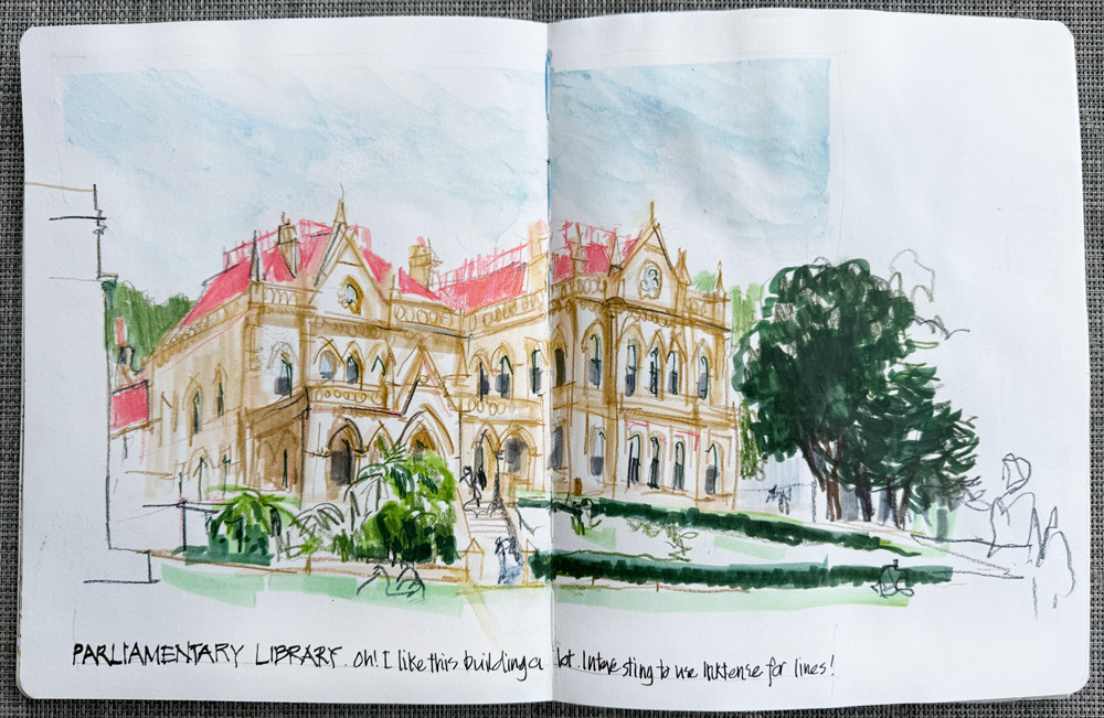 Not-quite-finished sketch of the gorgeous Parliamentary Library next door.
