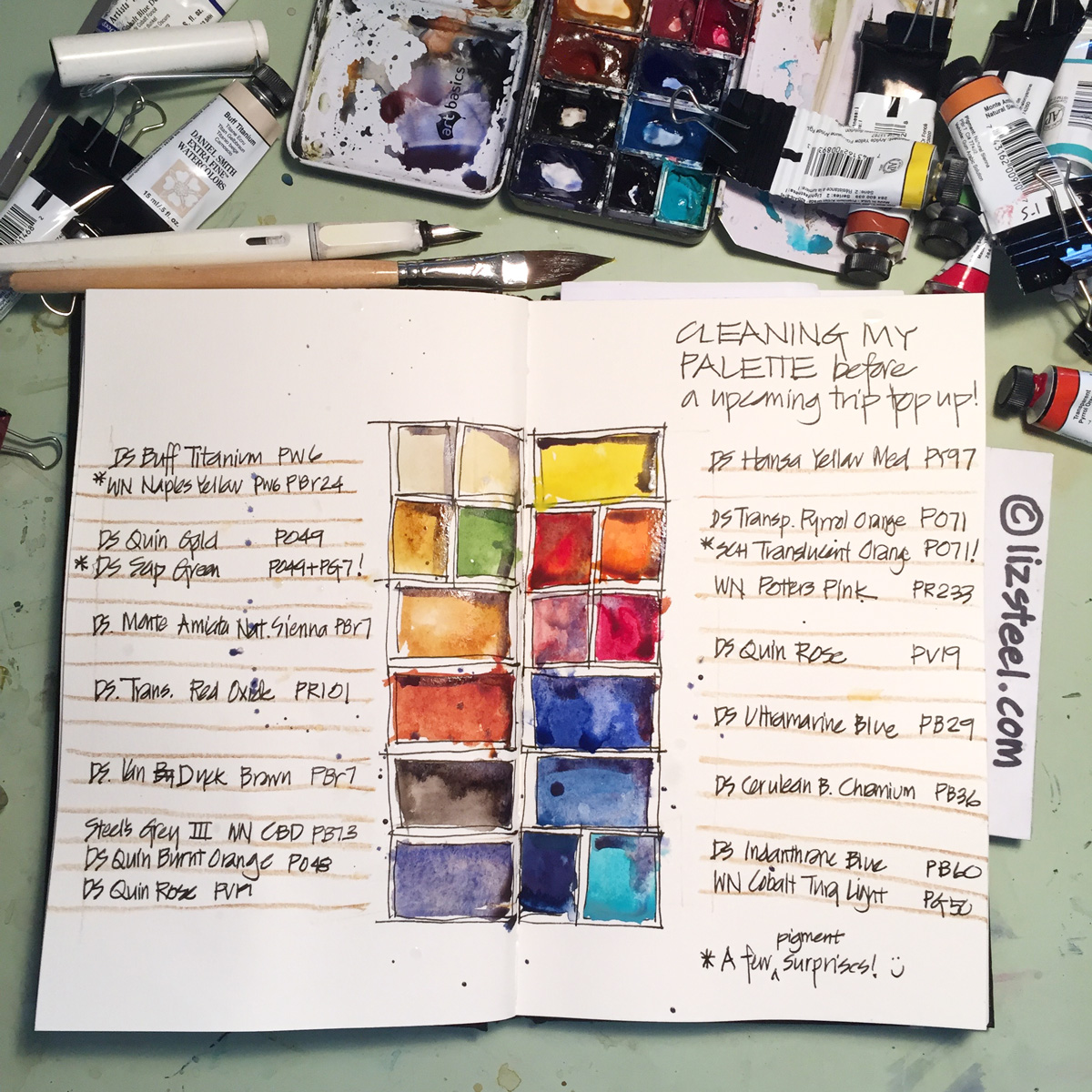 Here is a large version (click to see larger). As I had made a few minor tweaks based on colour in the last 6 months, I hadn’t checked the pigments for a while so I had a few surprises. How did I not know that SCH Trans Orange and DS Transparent Pyrrol Orange are the same pigment? Also DS Sap green being Quin Gold and Pthalo Green was a big click moment – of course that is exactly what the colour is like! This isn’t a ‘locked in’ colour and neither is Naples Yellow which is currently occupying my 16th ‘fad’ colour spot.