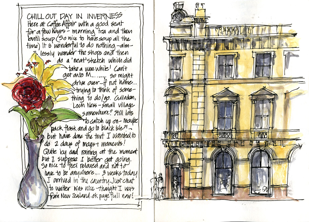 A relaxed day in Inverness – including this careful sketch from the comfort of a cozy cafe.