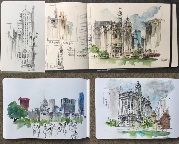 So this means that this year at the Urban Sketchers Symposium I was teaching techniques that were newly developed and implemented, making it fresh and particularly rewarding. I also loved my workshop location – Wrigley Square in the top northern corner of Millennium Park – and the small collection of buildings that we focused in on for the exercises. Indeed the star of the show was the amazing changing light on the facade of a Mies Van Der Rohe building – the black building.