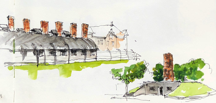 I wasn’t sure about going to Auschwitz as I’m fairly sensitive. I certainly didn’t want to do a guided tour and hear all the horrendous details – I can feel deeply without knowing absolutely everything. Most of the bus trips from Krakow included guided tours, but we did find one called a ‘contemplative tour’ which gave us a documentary in the bus and then around 2 hours of free time at the two camps, Auschwitz I and Auschwitz II – Birkenau. This worked well for us as it gave us sketching time which would have been impossible on the guided tours.