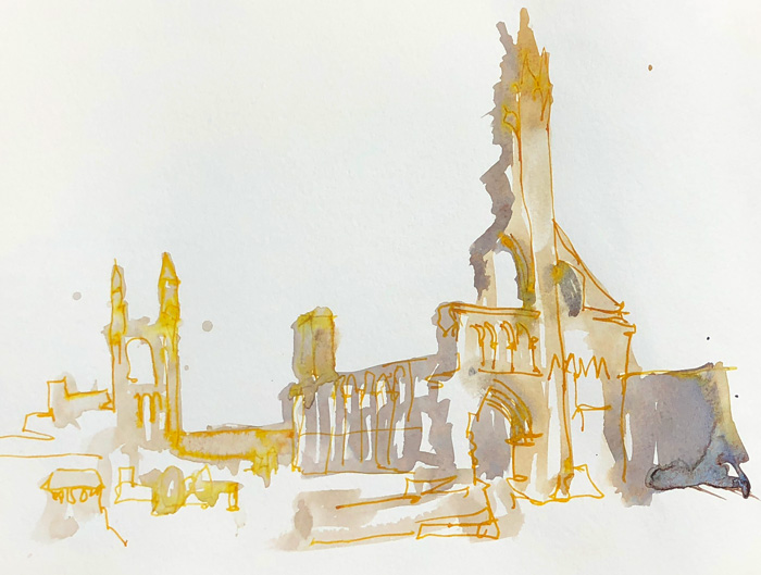 FInal sketch of St Andrews Cathedral was just a few simple shapes and then some lines – using my De Atramentis Document mixed Raw Sienna ink (yellow and brown) – drawing into the wet.