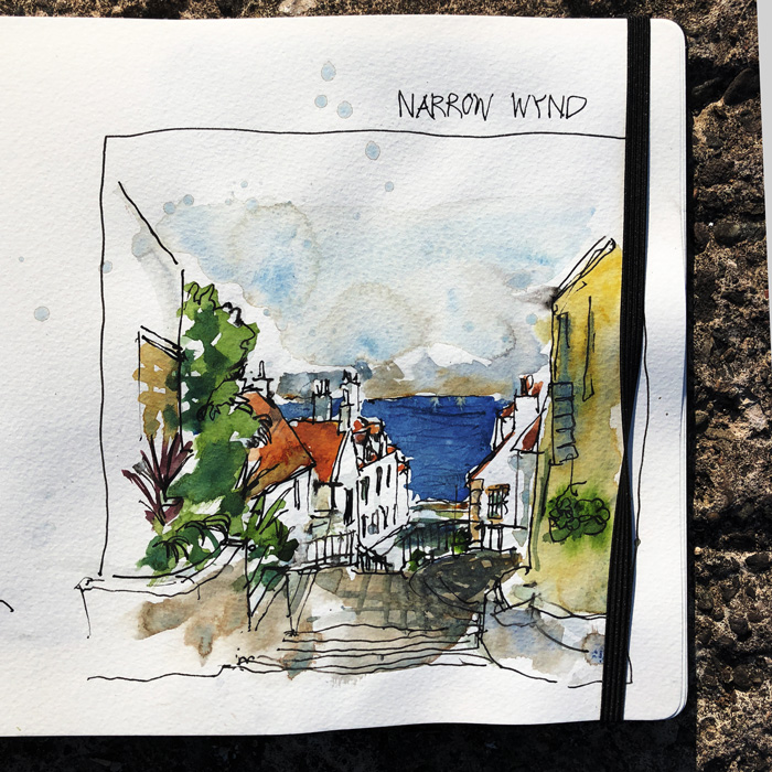 Looking down the Narrow Wynd. I drew this way too small. Thought at the time: Can I make time to have another go in the morning before I leave.