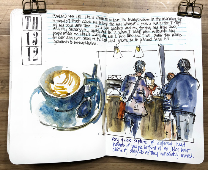 A working Saturday so that means my usual cafe visit. On this day I was interested in overlapping people to create depth and I tried a background wash around the coffee.