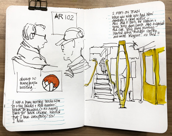 love your sketches etc. have been following you for ages online etc. I’m just curious, is that sketch of your post gym workout in Turramurra? (End of book #110). It looks like the car park at the back of Turramurra shops. I think I spotted you there a month or so back with your red sketch bag. Then thought I must be going mad, because I had just been looking at your blog on my phone while I was sitting in my car waiting to pick up my son from the station.
