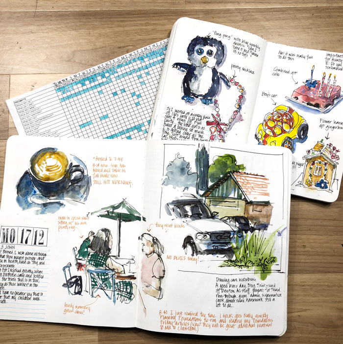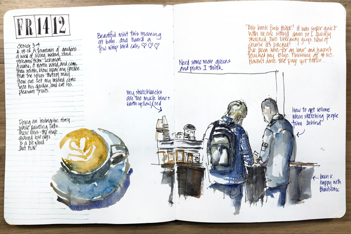 In fact I would say it’s as good as it’s ever been. That is a rather bold statement to make but my sketchbooks at the moment are definitely on par with my best periods of sketching everyday life. (I know this for a fact as I have been flipping through my old books recently and have been amazed at the looseness, colour and energy of my sketchbook pages from around 2014).