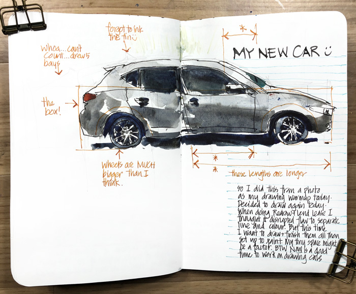 Finally in the evening, I got a chance to sketch my new car – Mazda 3 (if you are interested SP25 GT in Machine Grey). I’ve decided to focus on sketching cars at the moment as it is a bit topical. This sketch was done from a photo and I was interested to realise that I drew the wheels way too small.