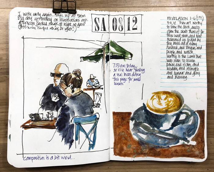The next day I didn’t have much time to sketch at the cafe but I still managed a quick line drawing in addition to my coffee.