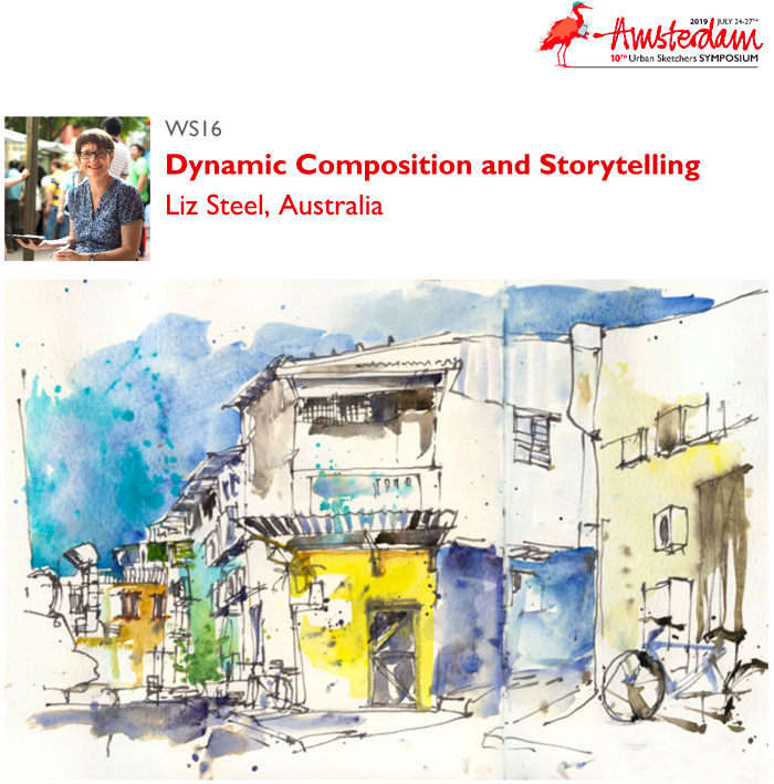 I feel very honoured to be teaching again at this year’s Urban Sketchers International Symposium in Amsterdam July 24-27. This will be my 10th symposium (I’m only one of 2 people who have been to all of them) and my 7th time teaching. But it’s the first time I will be teaching something other than ‘sketching architecture’. So it’s particularly exciting for me to be teaching composition!