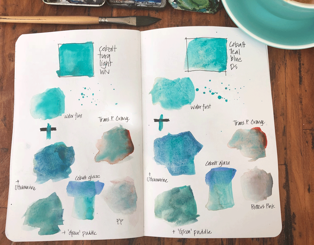 On Tuesday last week I left my palette at home and had to use my Daniel Smith for card which I have in the back of my Bujo for emergencies. And wow! Cobalt Teal Blue is very different! Less opaque but more granulating and I suspect, a better mixer. Note. I’ve been super happy with WN Cobalt Turquoise Light but the DS version might suit my coffee cups better.