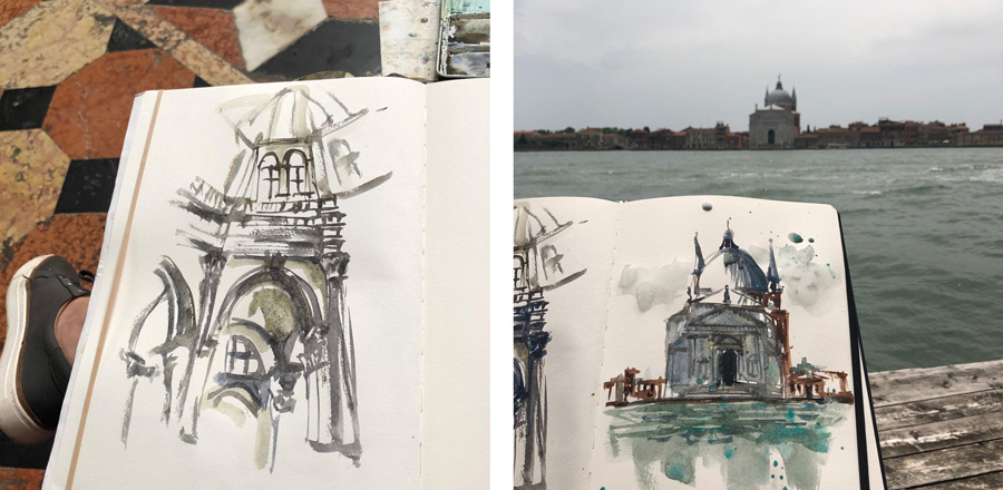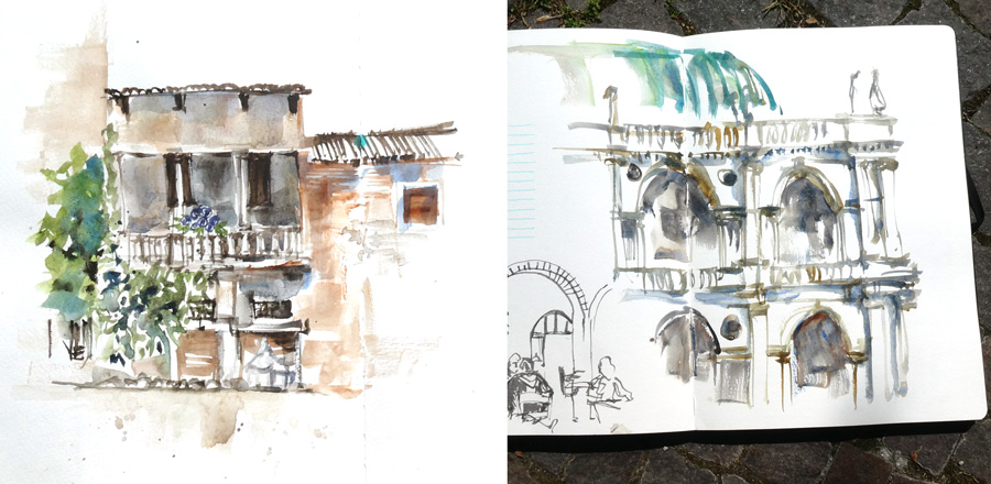Subject matter is perhaps the biggest factor. My approach to paint only is to try and work quickly trying to record the essence of my subject in the first pass. Simpler subjects make this much easier – eg. objects on the table (coffee, tea, food), single buildings and landscapes. More complex street scenes are much harder! I tried on two occasions on my big Venice day to sketch San Marco Piazza in paint-only (standing up) but both times I had to switch to pen to pull it all together.