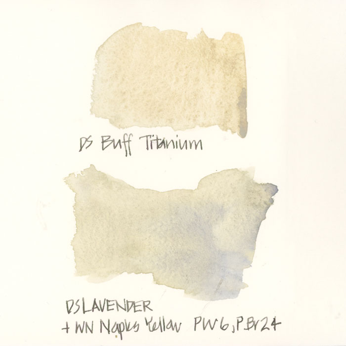 I did mention that I took out Buff Titanium at the same time but I wasn’t implying that Lavender was a substitute for it. Although when I mix it with Naples Yellow it does create an interesting buff-like wash – I think this was an idea I got from Shari Blaukopf who convinced me a few months ago to put Naples Yellow back in my palette. Of course both of these paints are opaque and contain white (PW6) so have to be used with intent to prevent murky washes.
