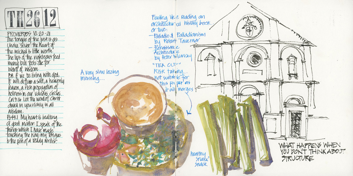 I haven’t had a lot of dedicated sketching time and it’s hard to fit it in when I’m around family, but my sketching diet (sketching everything I eat as I’m eating it) has been a great way to keep up my sketching and create colourful pages.