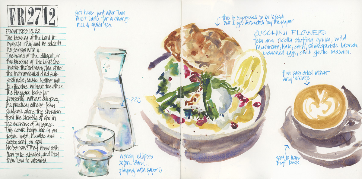 A quiet breakfast at Goodfields – I’m still working out how best to use the paper. The high-pressured situation of sketching a hot breakfast is a good way to test it. And just for the record, I never let my food get too cold.