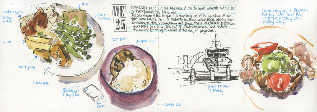 My final work day of the year… so all I managed was sketching my food. I left my palette at home and so used my emergency colours for the first time. The silly thing is that I thought the ‘blue’ pan was a pthalo blue and added yellow to it. But it was in fact a pthalo turquoise and the pure colour would have worked perfectly. So instead I painted a green cup!