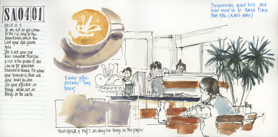 I didn’t get a chance to go on any sketching outings so these pages mainly contain food sketches. I missed half of a day this week, but otherwise I’ve been able to stick with my Sketching Diet. It’s hard on occasions to make the effort to sketch (with paint) every meal but I’m committed to it for a month and in fact, I intend to continue doing it for a little longer. It’s much harder to sketch food when I’m out with a friend – continuing the conversation, finding a spot for my sketching kit on a small cafe table and still enjoying the food while it is hot. Note: this last issue is essential… hmm, actually the first one is very important too! So I’m not always happy with the result, but I’m always very pleased that I made the effort. And I’m thankful for friends who understand my crazy behaviour!